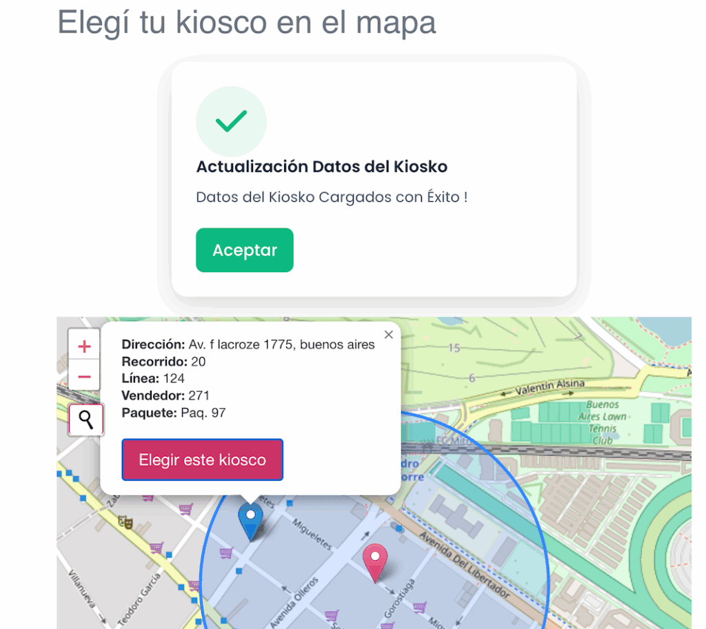 Una vez elegido el kiosko, te saldrá este aviso con el check verde y todos los datos se cargarán automáticamente cuando das click en “aceptar“. Podrás seguir con la compra y recordá que podés cambiar de kiosko todas las veces que quieras eligiéndolo desde el mapa.