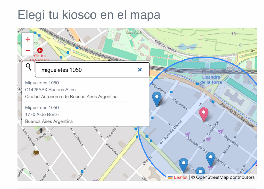 Si estás comprando por primera vez, después de completar tus datos personales podrás abrir la “Lupita” 🔎 en el mapa y escribir la dirección del domicilio mas cercano a donde querés que llegue la entrega. Una vez escrita la dirección en el campo de búsqueda, apretando ENTER podrás elegir tu dirección. Luego te aparecerán los kioskos habilitados para que elijas el que mas te sirve. Y pinchando en el ícono quedará seleccionado.
