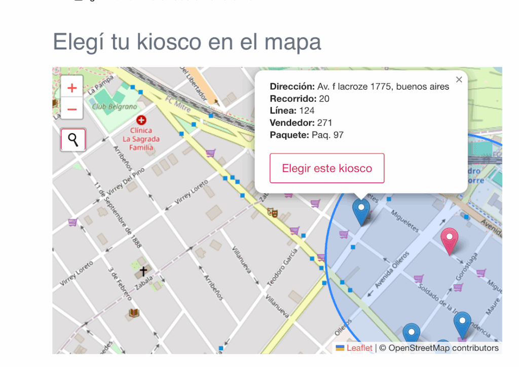 En el “pin” rojo verás la dirección buscada y los “pines” azules indican los kioskos cercanos y habilitados a esa dirección. Elegí el que más te convenga.